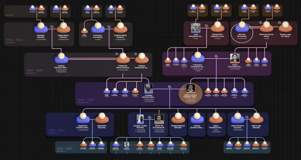 Como já publiquei aqui uma estória do meu trisavô Sérvulo, a imagem em destaque representa seis gerações de todos os antepassados do lado paterno, tendo como base o famoso Sérvulo, devidamente assinalado na imagem. O esquema inclui todos os pares que fazem parte do código genético da minha geração — irmãos e primos.
